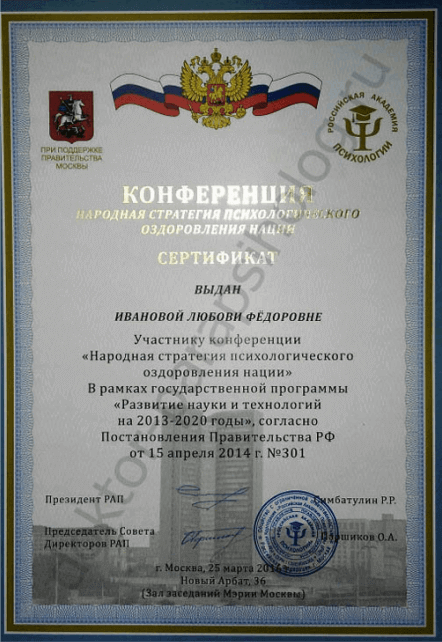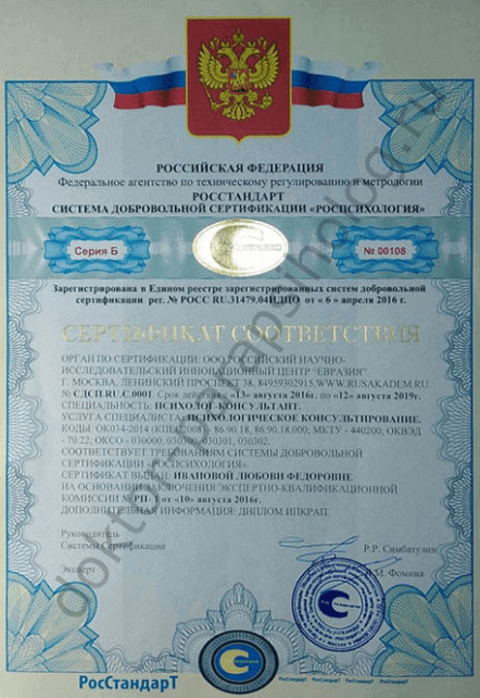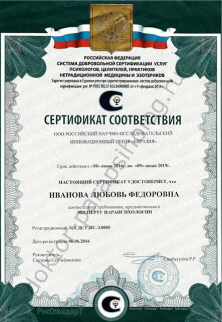 Оказанные мною услуги соответствуют требованиям Системы добровольной сертификации услуг психологов, целителей, практиков нетрадиционной медицины и эзотериков. Сертификаты выданы на основании Заключения Центральной Экспертно - квалификационной Комиссии (ЦЭКК РНИИЦ «Евразия»).